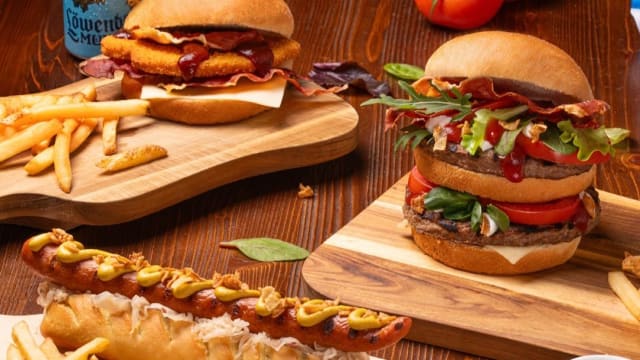 2 hamburger di manzo e formaggio, serviti con insalata, patate fritte, cetriolino bavarese, speck, cipolla croccante e salsa löwengrube.