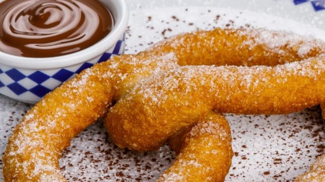 Brezel ricoperto di cioccolato bianco fuso e codette di zucchero.