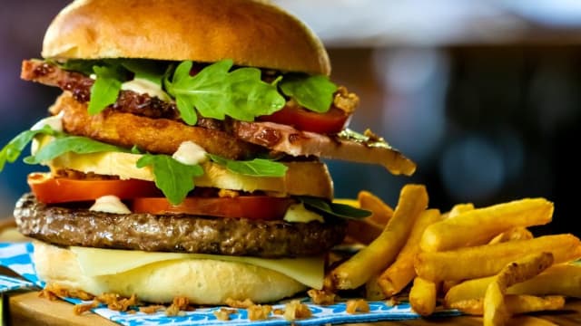 2 Hamburger di manzo e formaggio, serviti con insalata, verdure grigliate, cetriolino bavarese, speck croccante, cipolla croccante e salsa löwengrube.