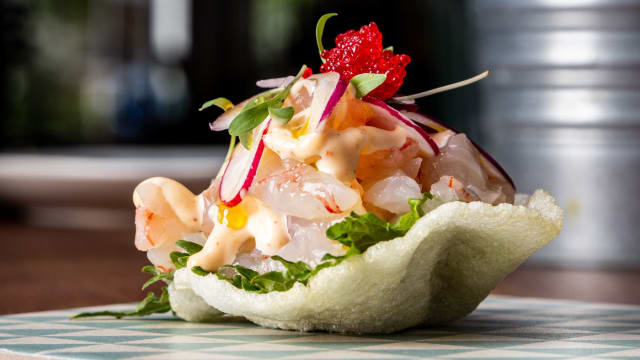 Ceviche de gambón sobre pan de gambas, hoja de sisho y salsa kimuchi(2 unidades)