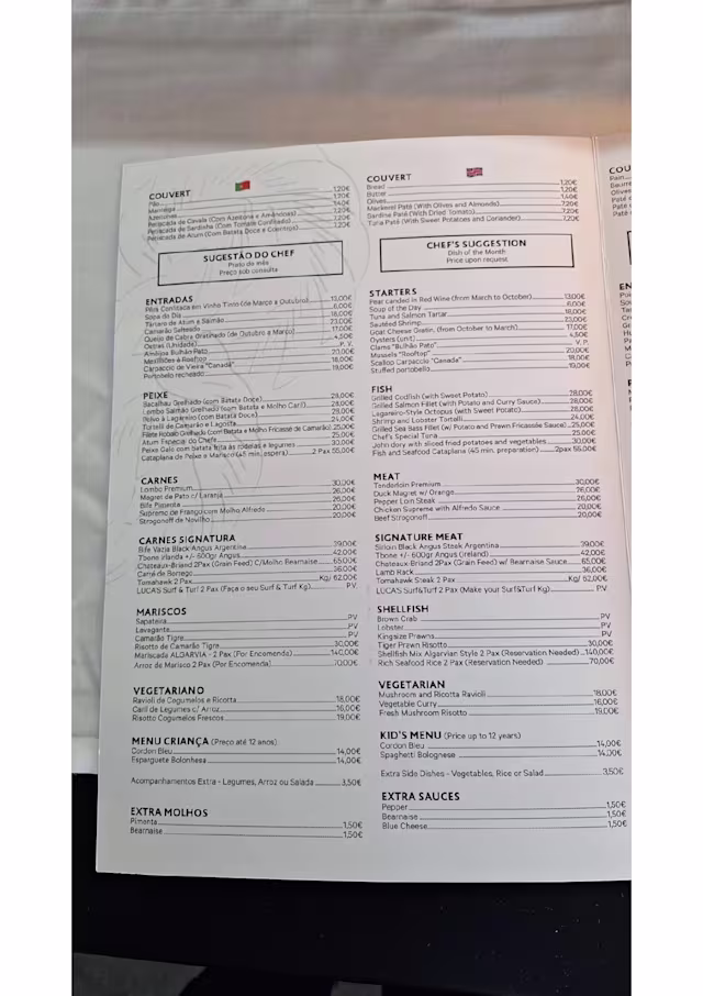 Everything was amazing! I am not a fan of fish menu options so you can imagine I was nervous about this restaurant choice. The location and reviews from Facebook Algarve groups suggested Lucas so I made the reservation and purposely didn’t look at the menu ahead of time. This restaurant was fabulous! The best tenderloin steak with pepper sauce I have ever had and my husband loved the shrimp and lobster tortelli! The view …. Breathtaking! The only thing better than the food and location was the team working there. Everyone was so personable! They were engaged with their customers and clearly there are many people that visit every time they visit in the Algarve! We will definitely eat there again on our next visit!