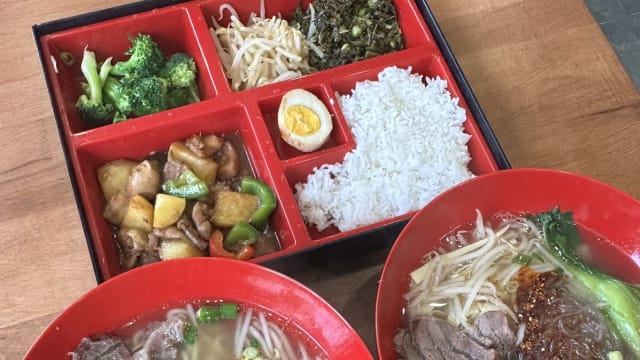 Riz au boeuf braisé et carotte accompagné d'un oeuf mariné et 3 légumes variés une boisson