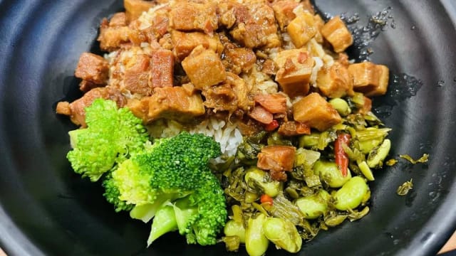 Riz au porc mijoté taiwanais avec oignon accompagné d'un oeuf mariné et 3 légumes variésune boisson