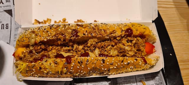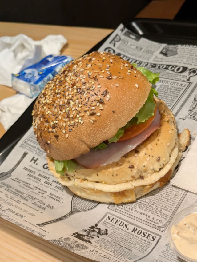Pains boulanger aux céréales, steack de bœuf français, tranches de cheddar gratiné au four, salade du jardin, oignons frits croustillants, concombre, poivrons frais, sauce mayonnaise et ketchup