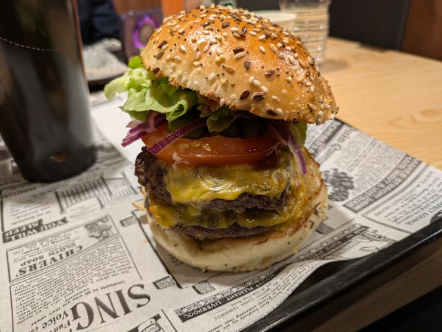 Pain boulanger aux céréales, steack de bœuf français, tranches de cheddar gratiné au four, salade fraîche, tomates du jardin, oignons frits croustillants, cornichons, sauce Américaine légèrement tomatée.