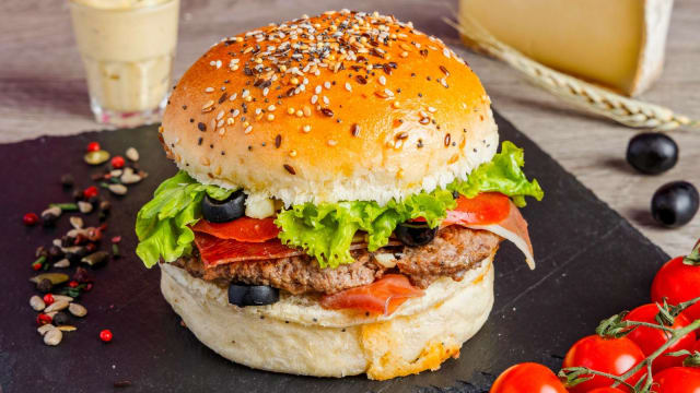 Pain boulanger aux céréales, steack de bœuf français, tranches de bacon fumé, cheddar gratiné au four, salade fraîche, tomates du jardin, oignons rouges, poivrons frais, sauce au poivre noir.