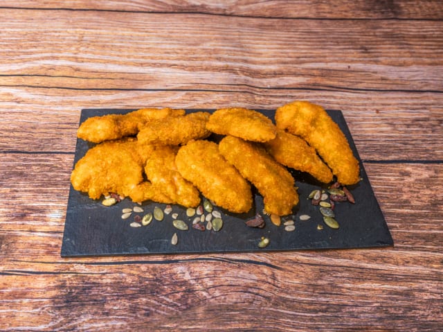 Filets de poulet rôti marinés dans les épices, tranches de cheddar, salade fraîche de saison, tomates du jardin, poivrons frais, jalapeños, vinaigrette aux agrumes.