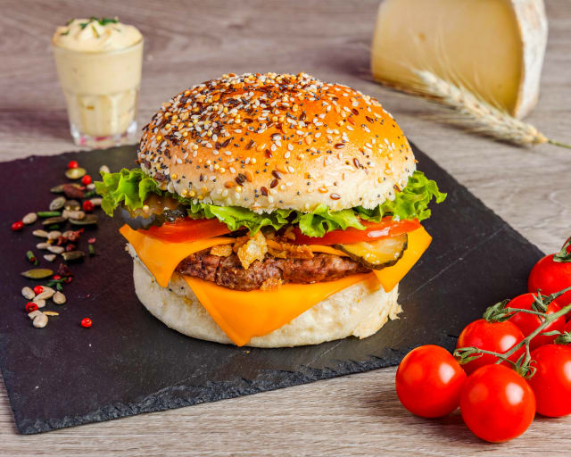 Bun boulanger aux céréales, steack de bœuf français, tranches de cheddar gratiné au four, salade du jardin, oignons frits croustillants, concombre, poivrons frais, sauce mayonnaise et ketchup.