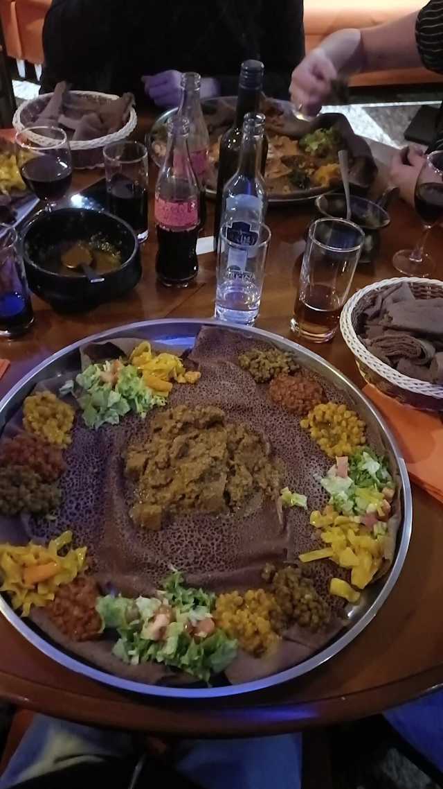 - Plat à base d'injera (galette éthiopienne) et de viande séchée de bœuf marinés dans une sauce aux oignons, tomates et savoureux épices