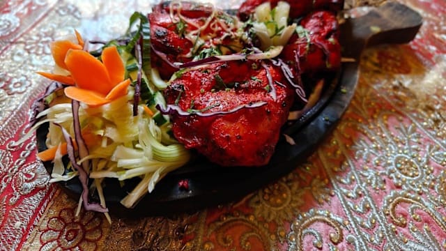 Lammracks marinerade i indiska kryddor och grillade i traditionell tandooriugn, serverade med gyllene saffransris och toppade med en krispig vegobiff och citron.
