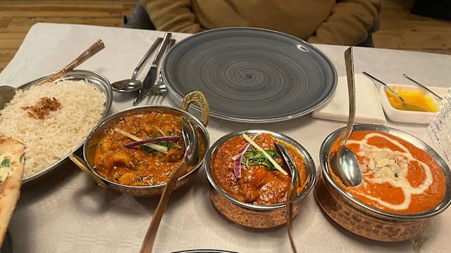 Serveras med flera smårätter: lammgryta, chicken butter masala, tandoorigrillad kyckling, stekta grönsaker och papadam.