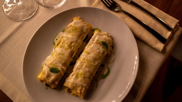 Tortelli fatti a mano di ossobuco, guazzetto di parmigiano e fondo di vitella