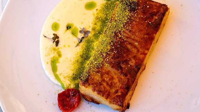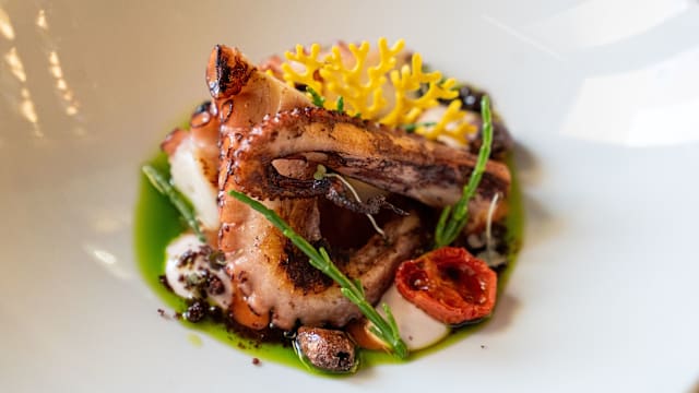 - Polpo prima cotto, poi scottato per la massima tenerezza all'interno e la croccantezza all'esterno. La base è un cremoso di topinambur delicato e setoso, arricchito da maionese del polpo. Il porro croccante aggiunge la nota vegetale. Piatto elegante e curato nella sua essenzialità.