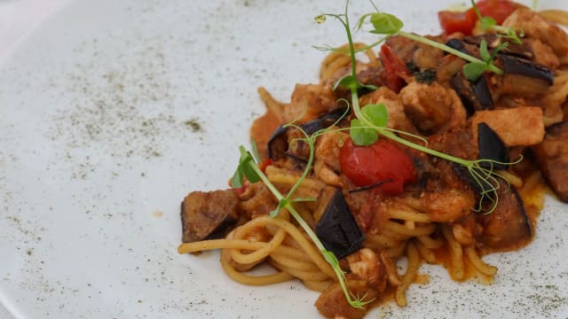 Spaghetto con aglio, olio, peperoncino, crema di melanzane bruciate e tartare di gambero al lime