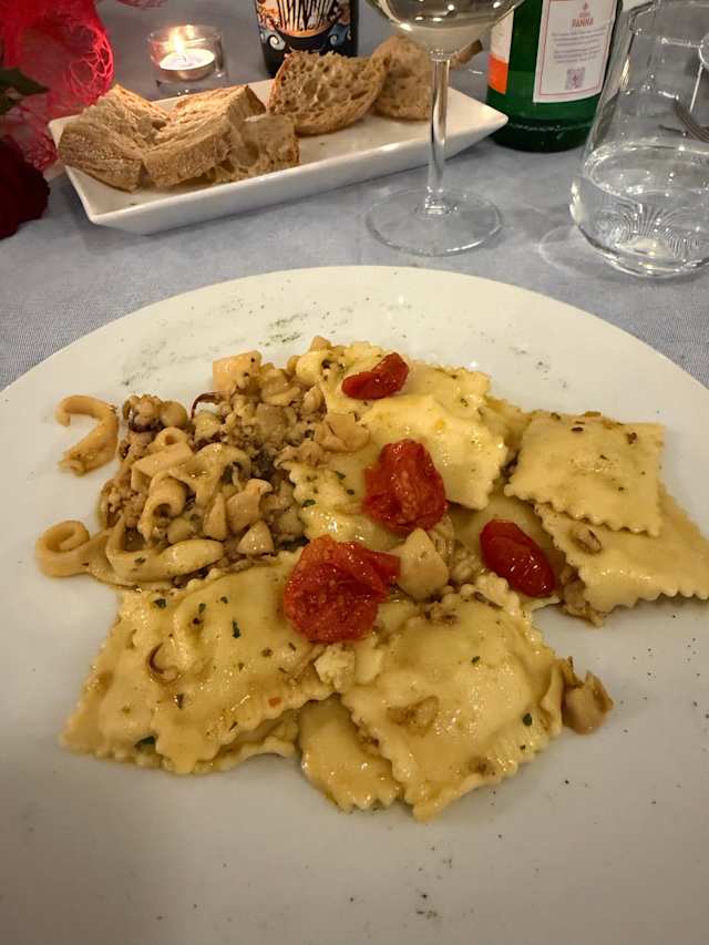 - Ravioli di branzino con calamari, pomodorini confit e curry