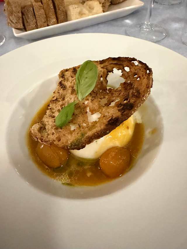 - Burrata ripiena di pesto con tiepido di datterini gialli e velo di pane