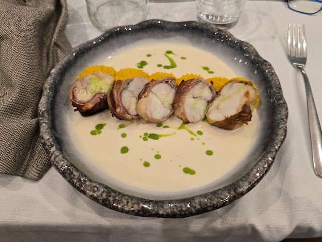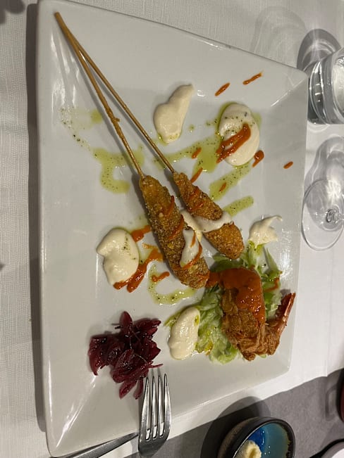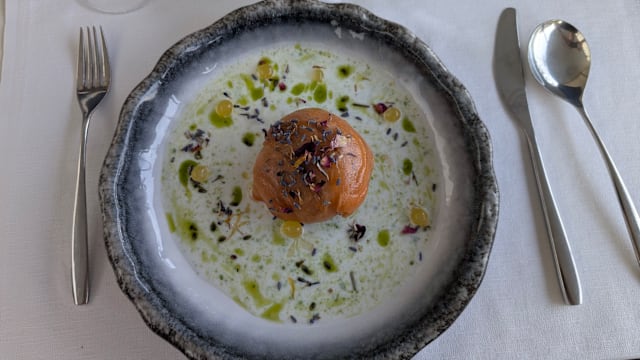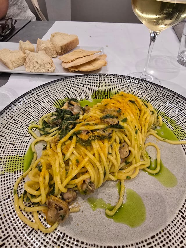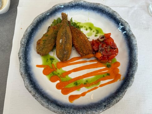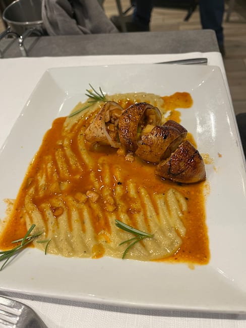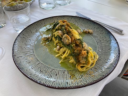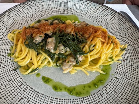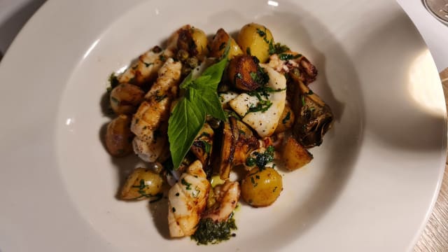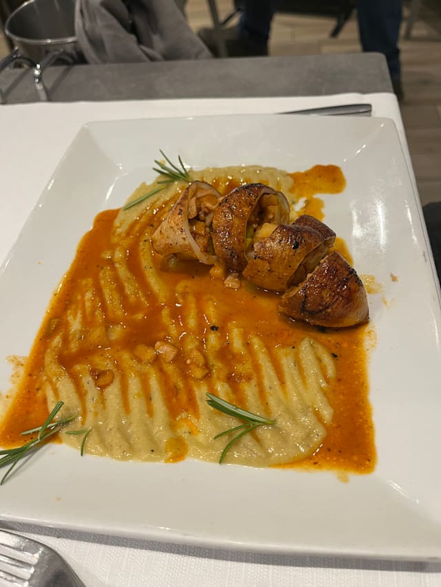 8.5/10Chose this place due to good reviews on Trip Advisor and only a 5 minute walk from our accomodation. Very welcoming & congenial host/sommelier and pleasant enough waitress. My starter of prawns two ways was delicious(!), my husband chose the cheese & potato tart which was quite bland and of a grainy texture. For main course I chose the asparagus, vegetable & barrata macheroni which was quite disappointing. By the (English ) description I was expecting a creamy sauce with lots of burrata....basically there was a dessert spoon of burrata as a garnish on top of a big bowl of (very!) al dente macheroni. My husband chose the fried calamari & prawn. There were only two (unpeeled) prawns and barely any batter on any of it. Nice ambience though and nice wine....we went for a couple of glasses of house prosecco and the cheapest bottle of Chardonnay which was Italian. Wouldn't rush to go again....the descriptions are a bit pretentious and inaccurate, but none of it was terrible.
