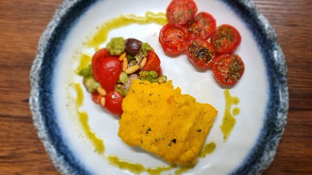 - Con bianco di pescato, cruditè di verdure e germogli