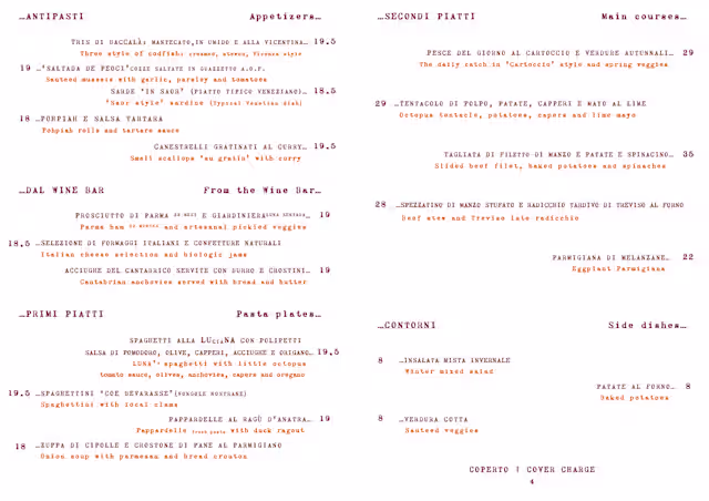 10/10+1We came back again! Best in Venice. Nothing generic. All superb. Setting, menu, chef, service, wine list, music! Fantastic. Our favourite hidden gem with their wine bar next door!