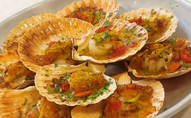 - Capesante gratinate, con uno strato dorato di pangrattato, servite con zucchine e pomodorini al forno