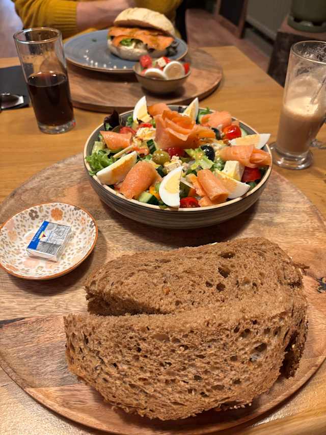 - Diverse soorten brood met slaatje, aioli, huisgemaakte tonijsalade en eiersalade, brie, noten en boter.