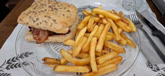Pane sandwich con semi di girasole, hamburger di chianina (200 gr.), pomodoro, bacon, insalata, scamorza, cipolla caramellata, salsa barbecue.