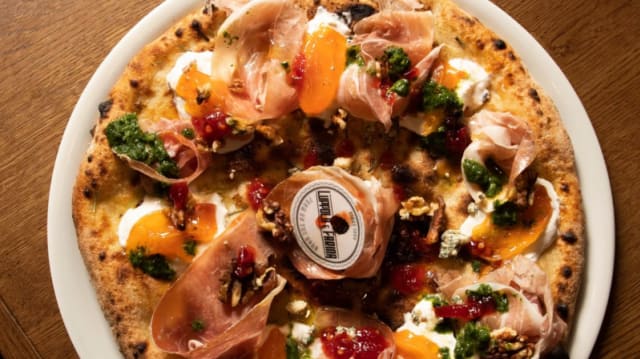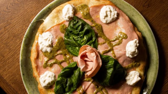 Fiordilatte. dopo cottura: : bresaola di tonno(salume di mare), stracciata di andria, sublime pesto di pistacchio e limone , polvere di pistacchio sul cornicione, zeste di limone, basilico vetrificato.