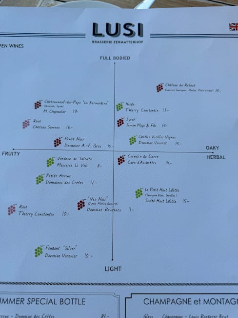 10/10A wonderful restaurant. Exquisite food and excellent wine. Although the staff were busy - it was the downhill World Cup ski preparations making Zermatt very crowded - the staff worked hard to make us feel very special. Lavish, airy dining room. We loved every minute of Lusi Brasserie at the Zermatterhof Hotel and will be back.