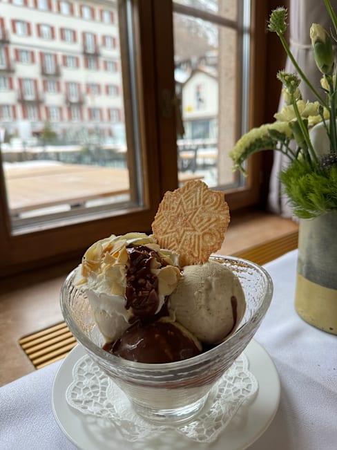 7/10Beautiful dining room, but atmosphere a bit ‘stuffy’. Team were not very welcoming at first as we didn’t fit with the very smartly dressed clientele in the restaurant - but warmed up and were friendly. Brasserie menu and food a bit out of kilter with the fine dining decor and atmosphere they seemed to be cultivating. Very pleasant meal but not up to the high standards of many other Zermatt options.