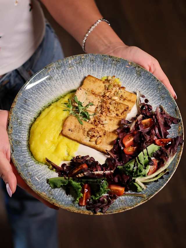 Tofu defumado e grelhado, purê de grão-de-bico, crumble de granola com panko
