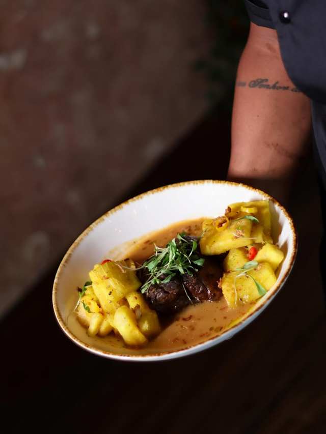 Costela de vaca a desmanchar com mandioca cozida, manteiga derretida e raspas de lima