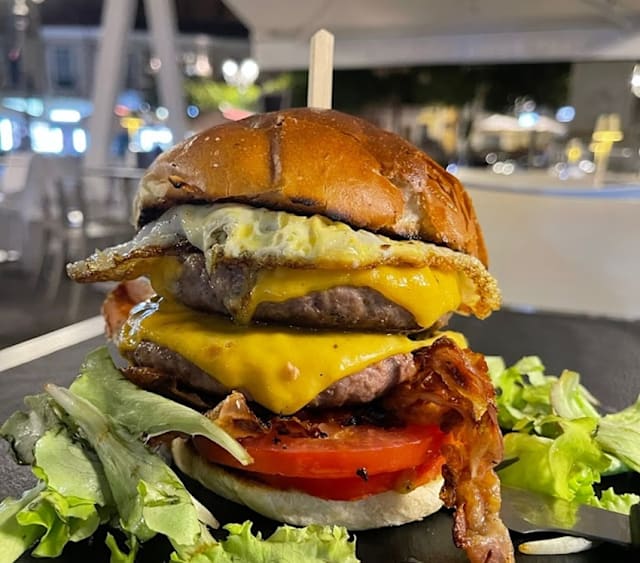- Pomodoro, doppio cheddar, doppio hamburger, bacon, uovo fritto, salse a scelta.