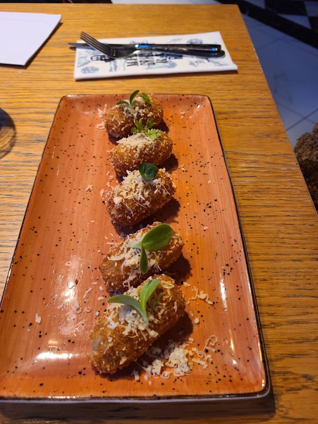 9/10Very fun and personable waiter. Very good artichoke and chicken satay. Both ribeyes over cooked. We asked for medium-rare, got medium-well. French fries were excellent.