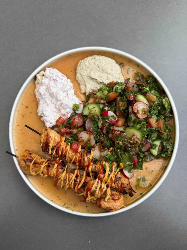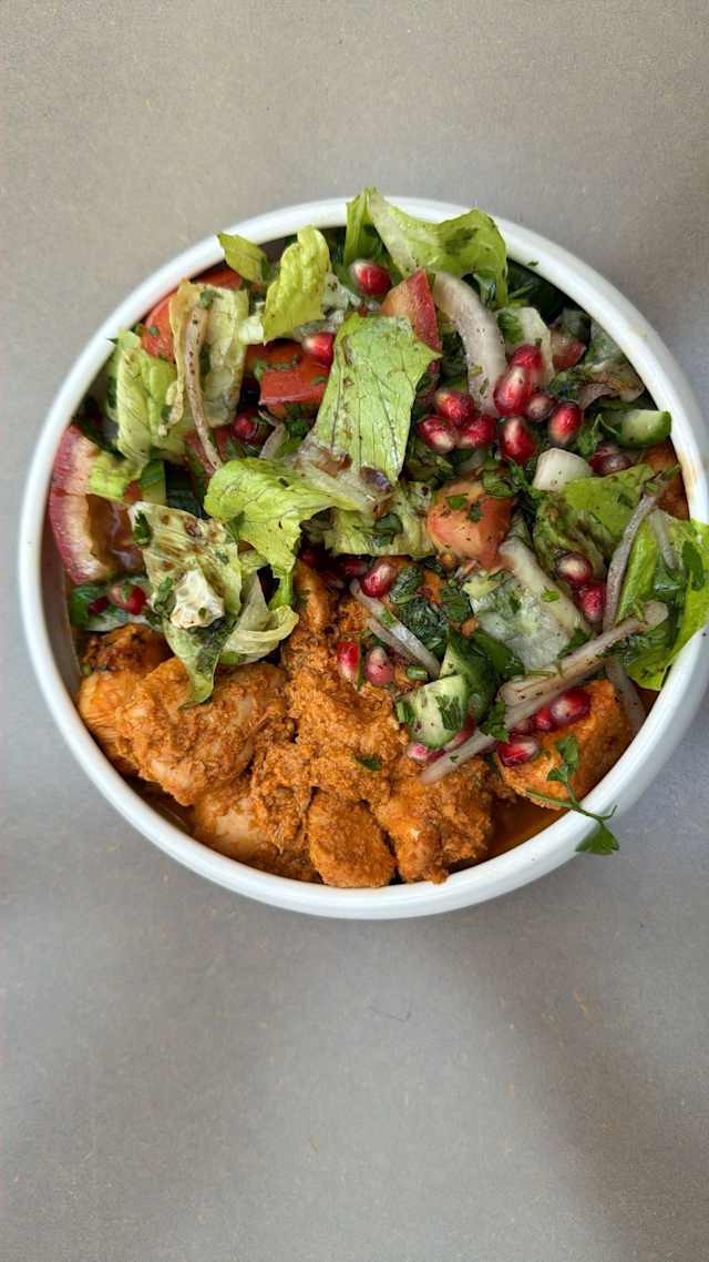 - Grilled chicken with coleslaw, lettuce, pickles & garlic sauce.