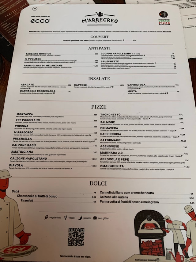 10/10M’arrecreo was an incredible experience! I ordered the 4 Formaggi pizza, and it was absolutely perfect — thin, airy dough with that authentic Neapolitan char, and the cheese blend was rich and full of flavor. For dessert, I tried the tiramisu and the babà, and both were outstanding. The tiramisu was creamy and light, while the babà had the perfect balance of texture and sweetness. The staff were warm and attentive, and even though the restaurant was busy, service was fast. The atmosphere is lively but welcoming, and prices are very fair for the quality. If you want true Italian pizza and desserts in Lisbon, this is the spot. Highly recommended — I’ll definitely be coming back!