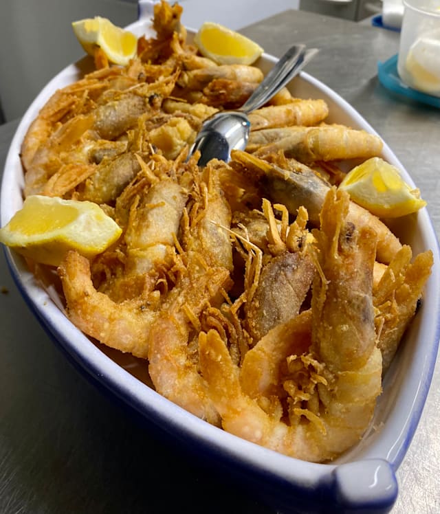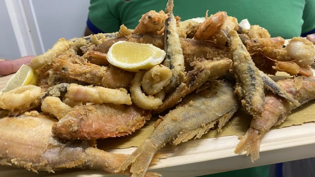 fried squid, guacamole sauce, misticanza, dried tomatoes and stracciatella