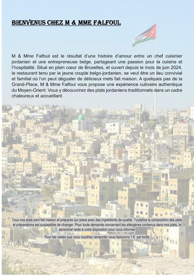 10/10M & Mme Falfoul is a nice family owned place. The food was very delicious, although they didn't have the sea bass which I wanted originally. They have good Jordanian dishes and wine. Service was very friendly and they made some changes to my dish to accommodate dietary requirements. I will happily go back again!