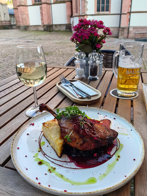 9/10I really enjoyed the potato gratin as a starter and the Baden sausage salad was good too and well presented. The waiter spoke great English and was very kind and the setting in a quiet square was lovely and quiet romantic. The discount was applied even though I no longer had a copy of my booking email, so better to keep it to be sure.