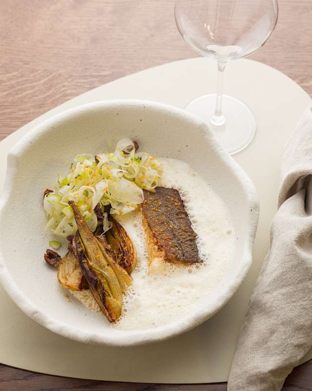 - Volaille fermière - asperge verte rôtie, espuma d'olive taggiasche et jus corsé à la sauge