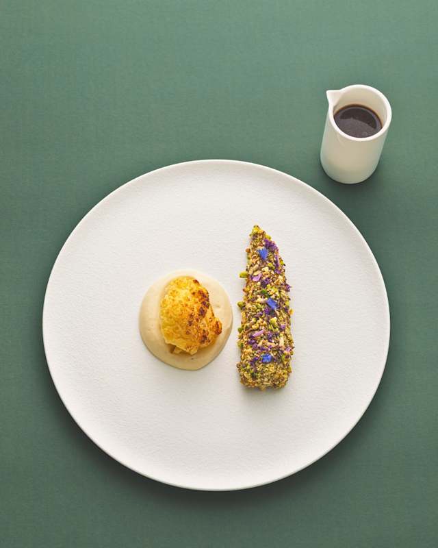 - Cabillaud - polenta à l'ail rose, epinard en jeune pousse et crème de haddock ou volaille fermière - asperge verte rôtie, espuma d'olive taggiashe et jus corsé à la sauge