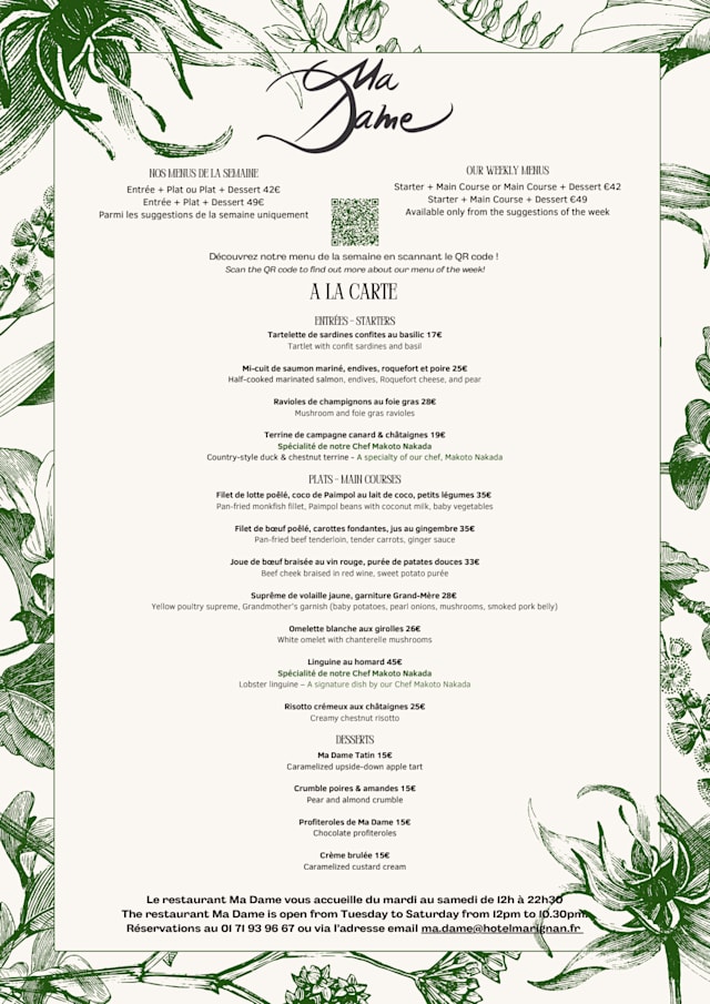10/10It's my second time at Ma Dame. I like the atmosphere of the restaurant, the fine food, the very friendly staff, and it's very clean.