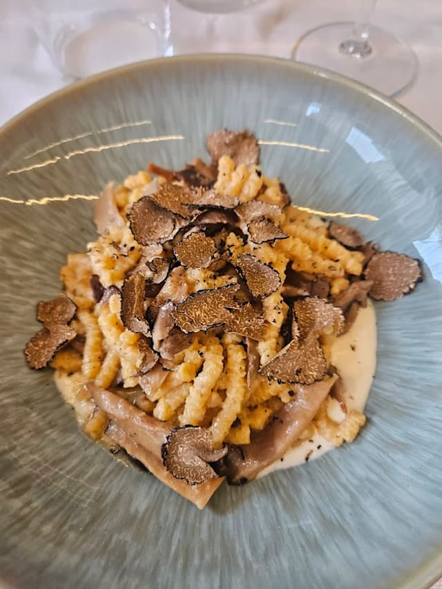 Passatelli asciutti con cardoncelli saltati su crema di parmigiano 24 mesi,finiti con scaglie di tartufo nero