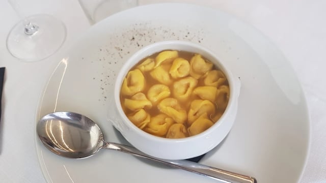 Tortelli neri ripieni di culatta, tartufo nero e mascarpone fresco su salsa al datterino finiti con scaglie di tartufo nero