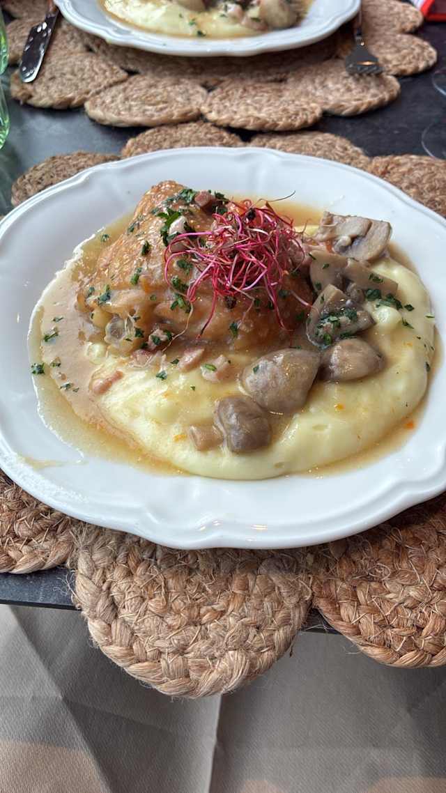 - ( Cidre, crème fraîche, carottes, champignons, oignons, laurier & thym )