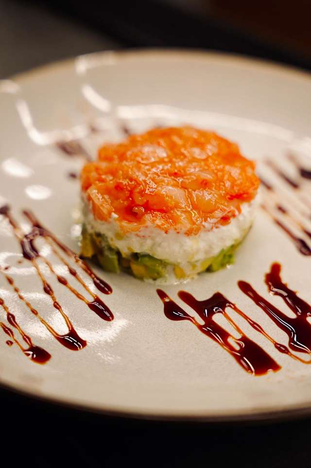- Tartare di gambero rosso con avocado, crema di peperoni e stracciata