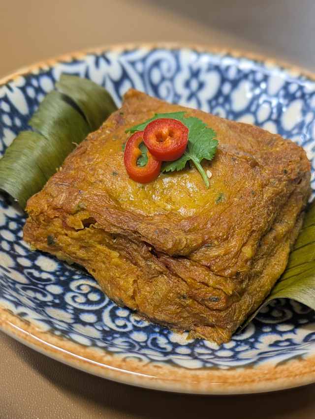 - Een smaakvolle mousse van verse vis, kokosmelk, en kruiden van de peranakan, gestoomd in bananenblad voor een unieke smaak vol verrassende aroma's