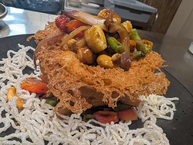 - Knapperig nestje van taro, gevuld met een levendige mix van gebakken groenten in een lichte, hartige saus. Een opwekkende mix van textuur en smaak.