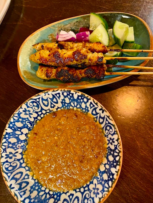 - Spiesjes van sappig gegrilde kip, gemarineerd in een aangename mix van citroengras, kurkuma, en traditionele maleisische specerijen. Geserveerd met een rijke, authentieke pindasaus, frisse komkommer en uitjes.