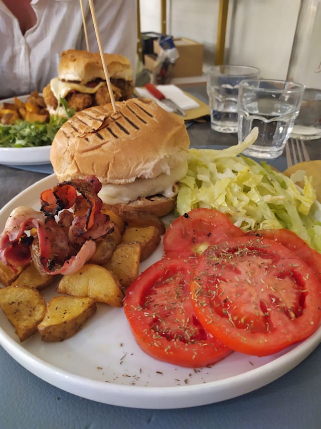 Panino, hamburger alla griglia con formaggio e provola, bacon croccante, salsa BBQ, insalata croccante, pomodori ramati; accompagnato da patate fresche fritte