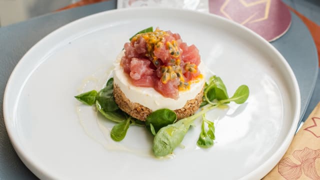 Crema di formaggio aromatizzata e spezzata grano infornato tartare di tonno rosso lime e frutto della passione